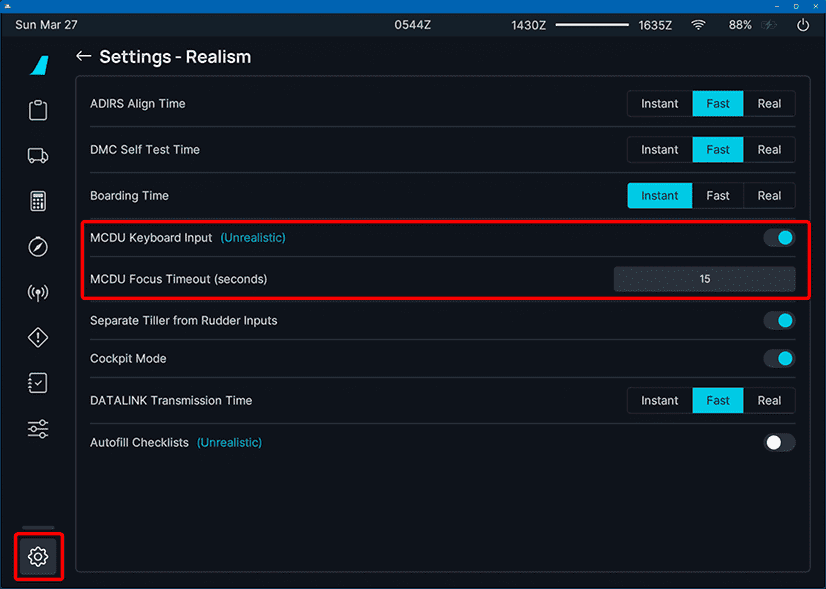 To begin using your keyboard with the MCDU, you must first enable the function within in the EFB settings: