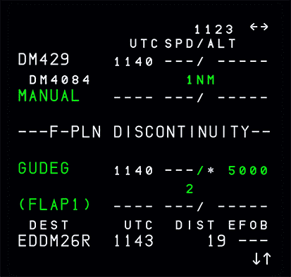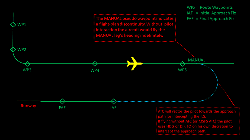 Sometimes discontinuities are also part of a procedure to indicate that manual guidance is required (mostly directed by ATC). The preceding legs are called MANUAL legs (Manual Termination leg).