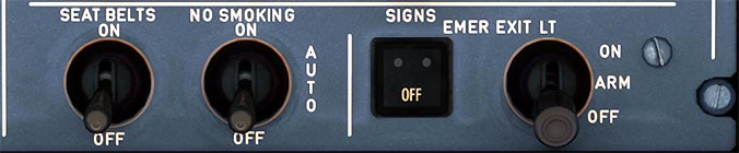 • NO SMOKING and EXIT signs come on when landing gear is extended and go off when landing gear is retracted. Low tone chime sounds when the lights go on or off.
