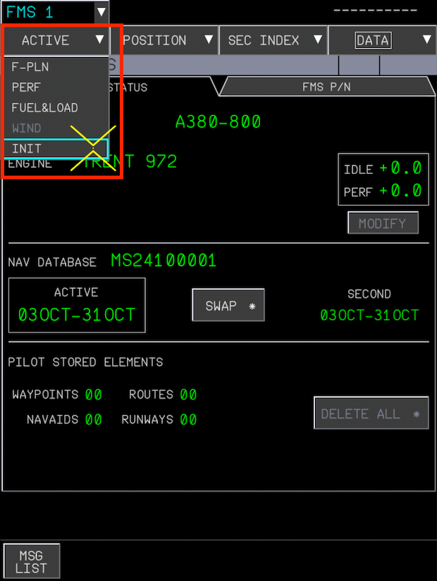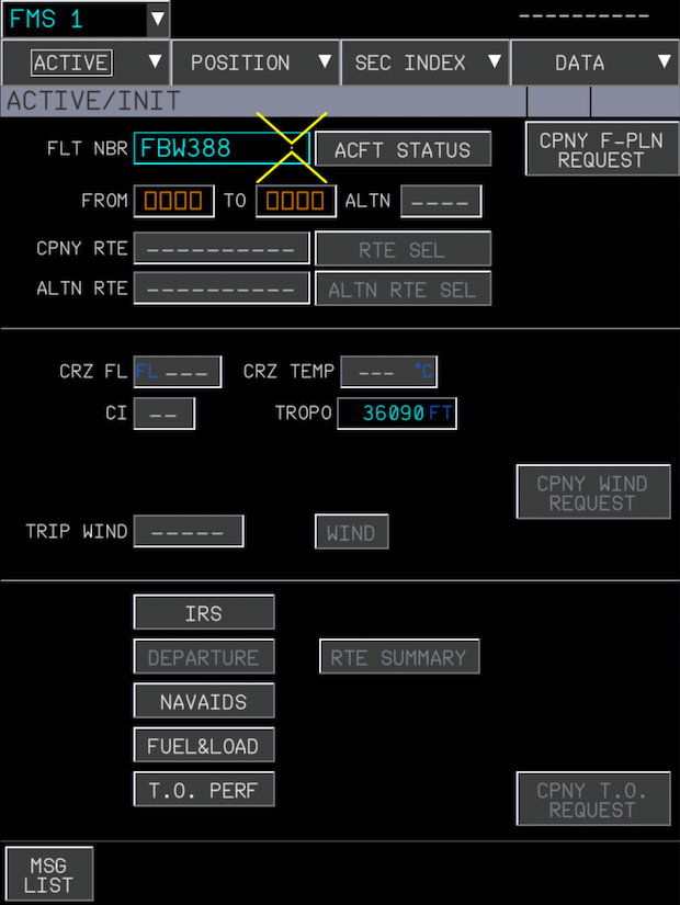The Flight Plan Initialization starts by opening the INIT page on the FMS from the ACTIVE menu.