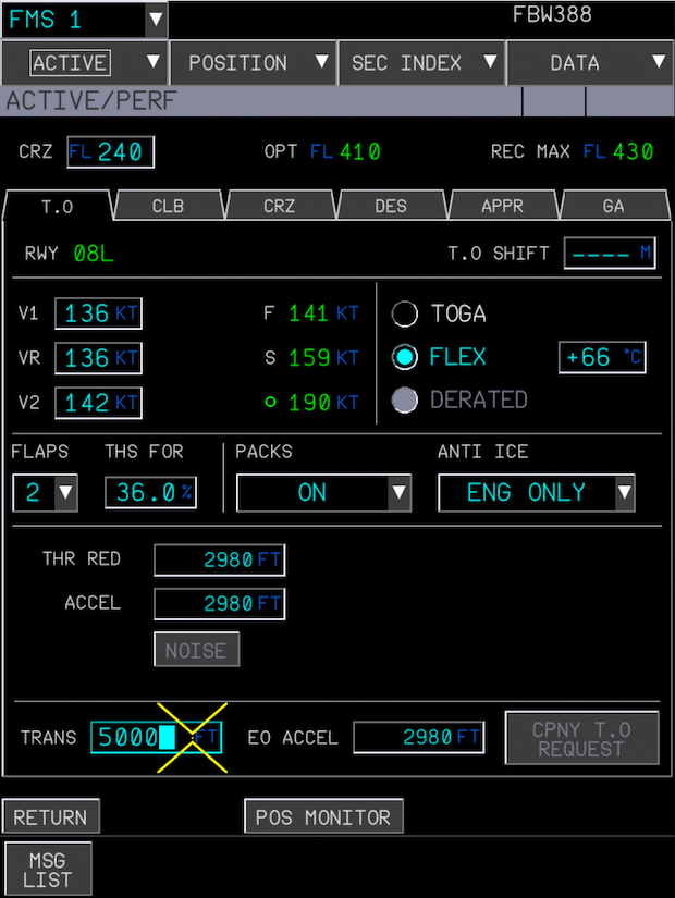 On the T.O PERF page, pilots enter or confirm settings like takeoff flaps and slats positions, engine thrust mode
