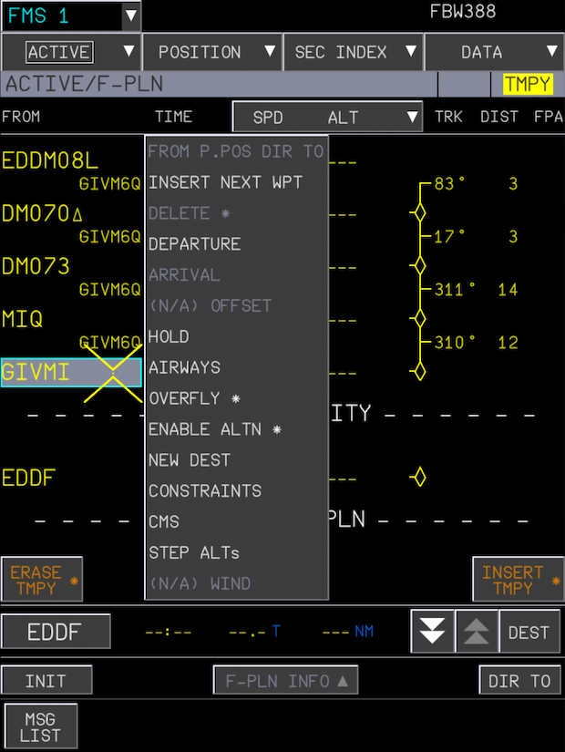 FLT NBRfield so a blue typing cursor appears in the field. - Using your keyboard, type the flight number you want to use (e.g. "FBW388") and press the