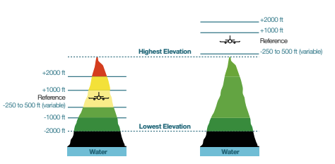 In this mode, terrain is displayed regarding the absolute terrain elevation (referring to the sea level instead of the aircraft elevation). It aims to improve terrain awareness of the flight crew. If the aircraft surpasses 2 000 ft (610 m) above the terrain, the terrain is still displayed but with a gradient of green (see right-side of image below). It also displays the highest and lowest terrain elevations as two figures in the bottom-right corner of the display.