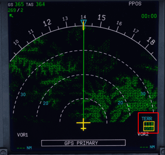 The Terrain Display can be enabled on either the left or right Navigation Display. To enable the display, push the TERR ON ND pushbutton and the display will begin to overlay the terrain ahead of the aircraft in a sweeping motion.